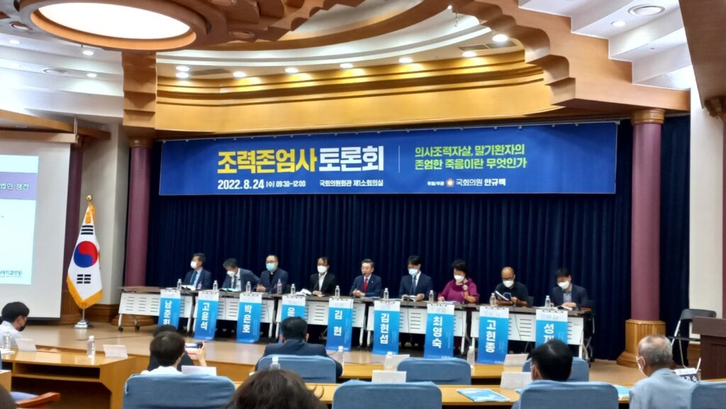 On August 13, 2022, a public seminar titled ”Systemizing End-Of-Life Medical Care More Urgent Than Allowing Euthanasia”, hosted by MNA Hyunyoung Shin, a former family physician, of the same party as the bill’s proposer, took place in a seminar room at the National Assembly Members’ Office building. All 9 panel participants including 6 medical doctors expressed opposition to the PAS bill on the grounds that society was not ready for it, and mainly discussed the need of developing a national end-of-life care system prior to the legalization of PAS.