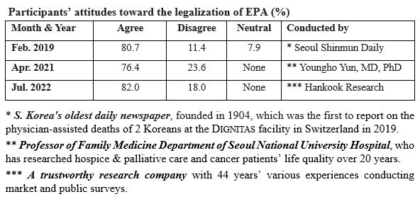 Before and after the submission of the first PAS bill, there were a few noteworthy surveys, based on responses by 1,000 participants, which investigated South Koreans’ attitudes toward the legalization of euthanasia or physician-assisted suicide (EPA). As shown by the table below, the results of the surveys show that 7 or 8 out of 10 Koreans are in favor of the legalization of EPA.